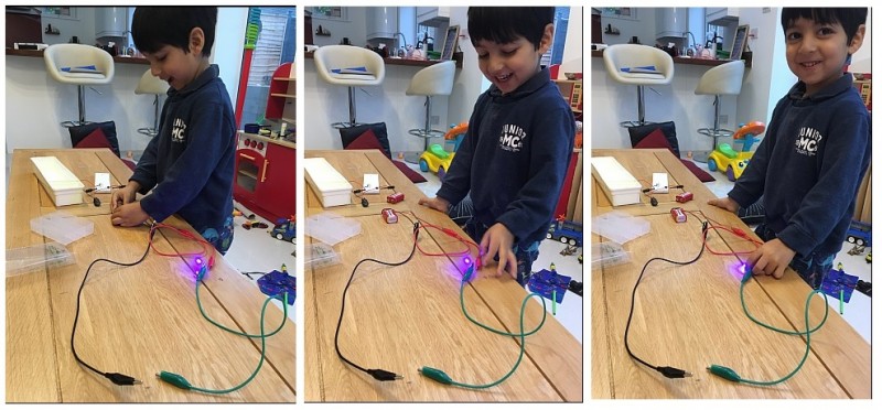 Adam having wired his first circuit and seeing his selected blue LED lit!